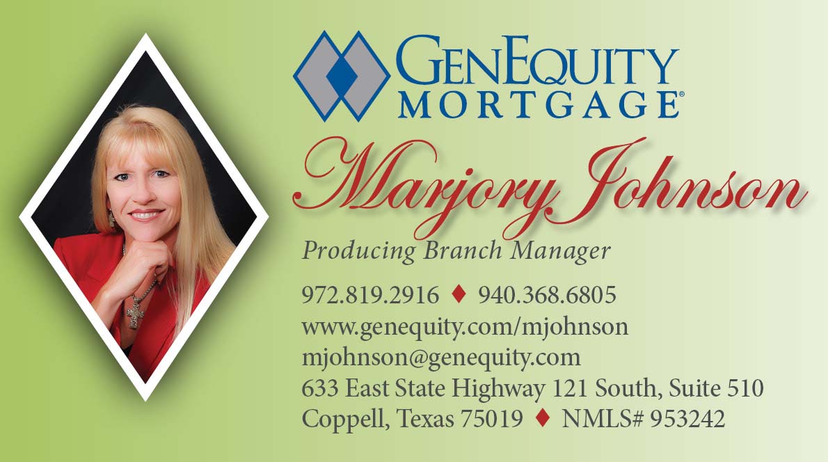 Marjory Johnson, GenEquity Home Finance Consultant, has more than 15 years of experience in the local real estate market including Dallas, Denton, Tarrant and Collin counties. If you are looking for someone with the knowledge and expertise to find you just the right home loan…be it for the purchase of a new home or a refinance of your existing home, Marjory will be an advocate for you, helping you through the process.